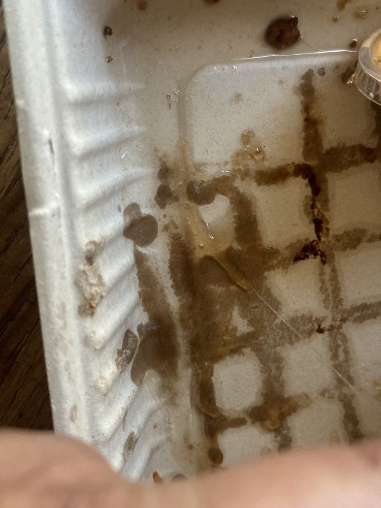 Buttermilk fried chicken tenders (on a liege waffle) with a side of syrup and special sauce.